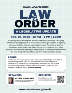 Join CenCal APA for an update on the most important changes from 2025, as we present legislation, case law, and personal anecdotes designed to enhance your understanding of the planning profession and ensure that you’re providing the best possible service and advice to the public, your employers, and your peers. (AICP CMs pending)